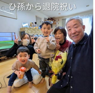 内観道場(左) ・ 主宰者写真 ・ ひ孫から退院祝い(右)
