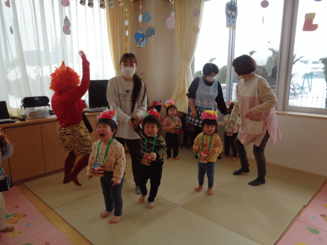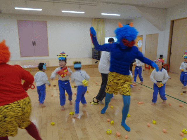 今日は、豆まきがありました。朝からドキドキしている子もいたのではないでしょうか⁇自分で作った鬼のお面と豆入れを身につけて、お部屋やホールで豆まきをしている所に鬼が登場!果敢に鬼に豆を投げている子もいれば、怖くて泣いてしまう子もいましたが、みんなで力を合わせておにをやっつけることができました!最後には福の神も登場し、節分カードももらいました。みんなにたくさんの福が訪れますように✨